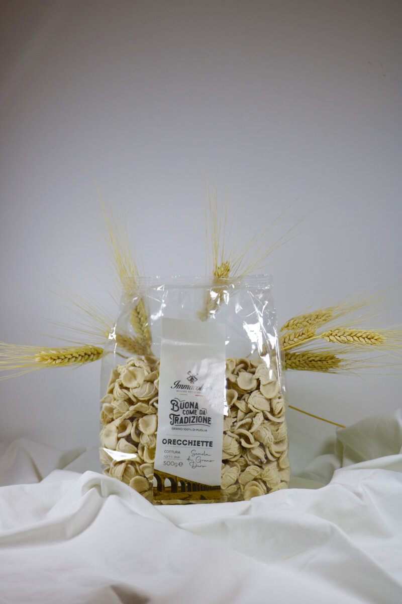 Le orecchiette di semola di grano duro nascono da una lavorazione per granatura, secondo la tradizione della pasta fatta a mano.